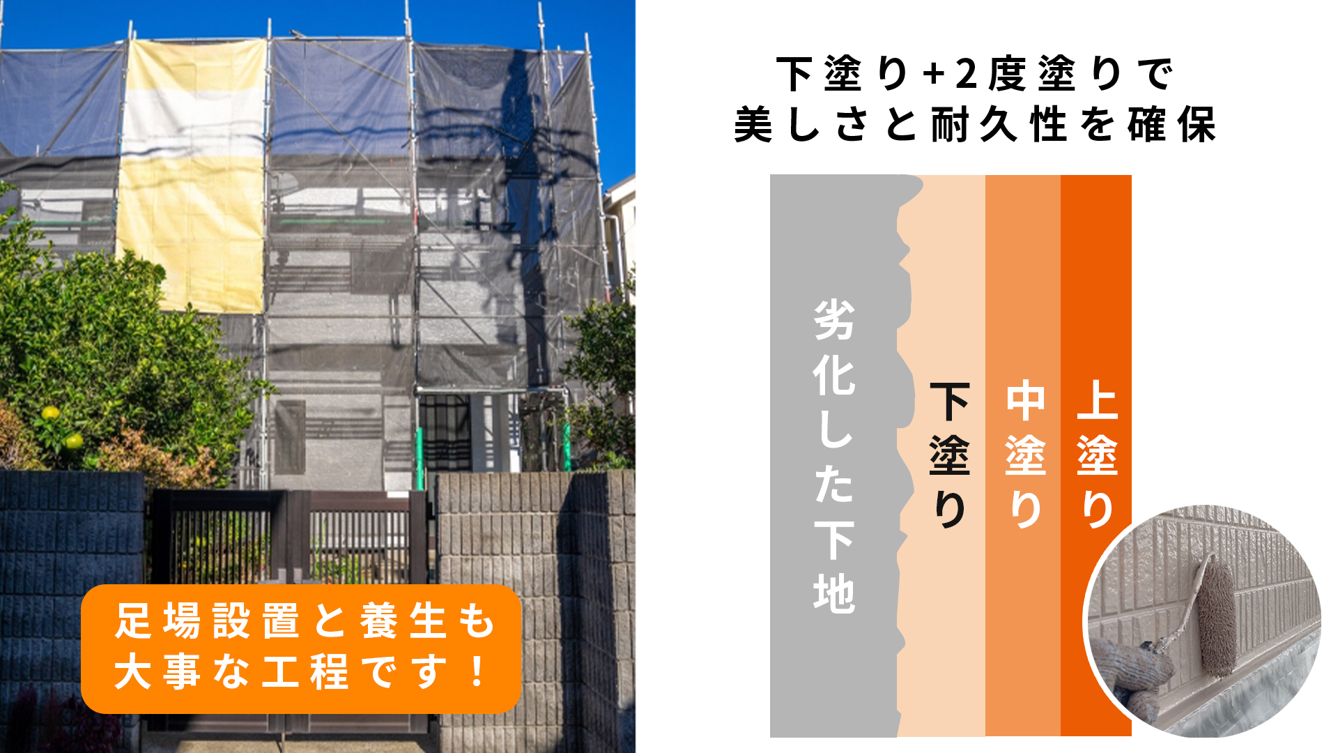 外壁塗装とあわせて行う補助的な工事のことです。塗装だけでは住まいを長く守れないため、劣化部分の補修や施工時に出る処理も必要になります。