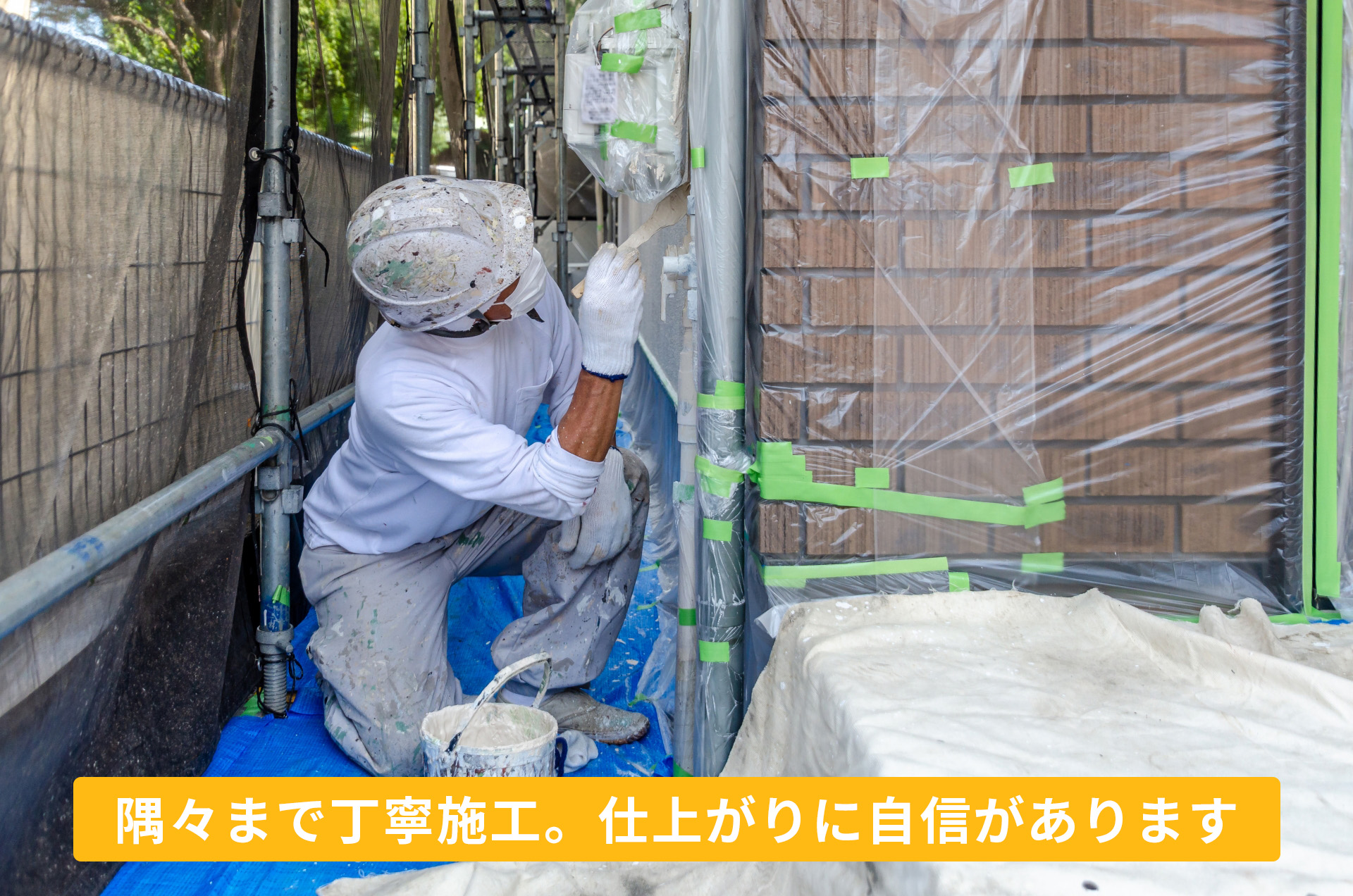 外壁塗装の際に、塗料が付いてはいけない窓・ドア・植木などをビニールシートやテープで覆って保護する作業のことです。仕上がりを美しく保ち、余計な汚れやトラブルを防ぐために欠かせません。1㎡あたり200〜500円程度、または一式で1万〜3万円程度が一般的です。