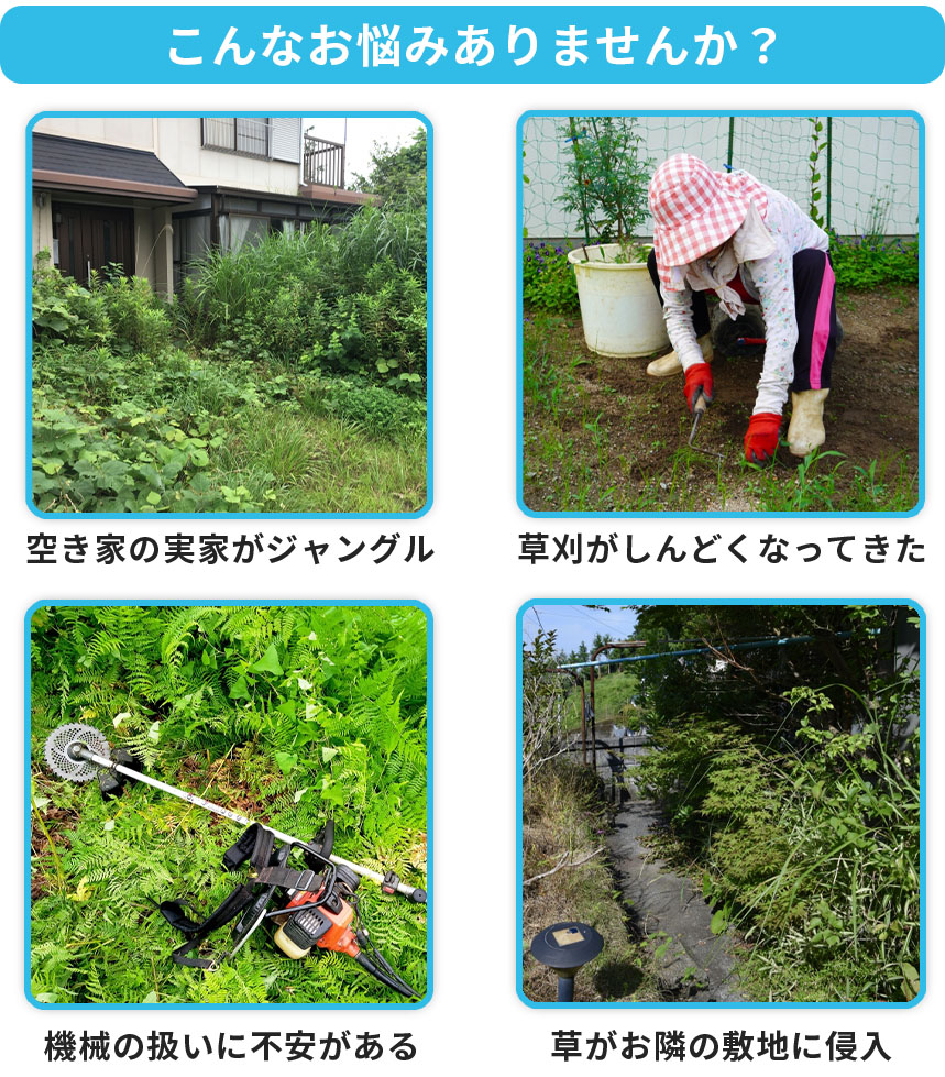 お庭や空き地の雑草は、放っておくと見た目が悪くなるだけでなく、虫が増えたり、ご近所への印象が悪くなったりと、思わぬトラブルにつながることがあります。体力的に草刈りがつらくなってきた、忙しくて手が回らない、といった声も多く、草の管理に悩んでいる方は少なくありません。