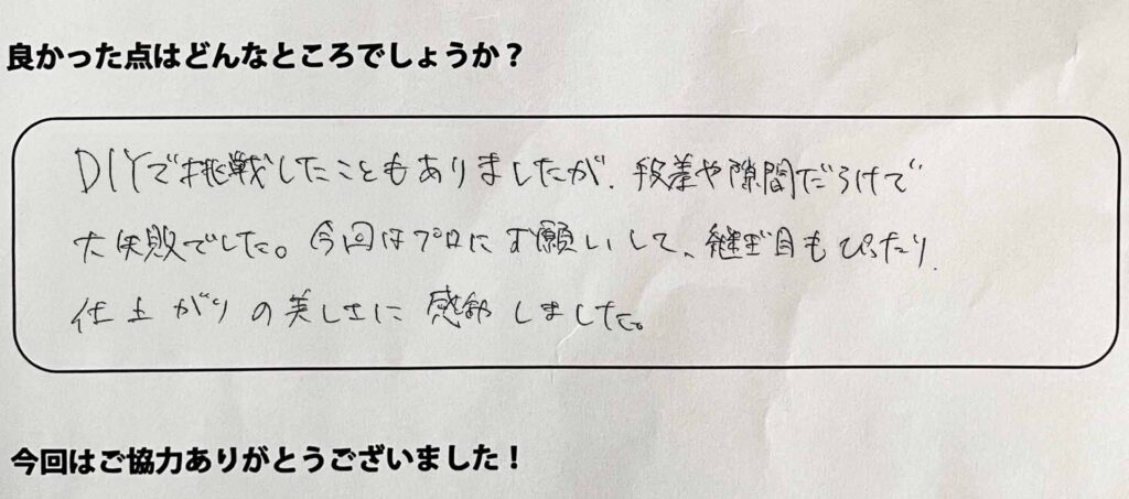 DIYで挑戦したこともありましたが、段差や隙間だらけで大失敗でした。今回はプロにお願いして、継ぎ目もぴったり、仕上がりの美しさに感動しました。