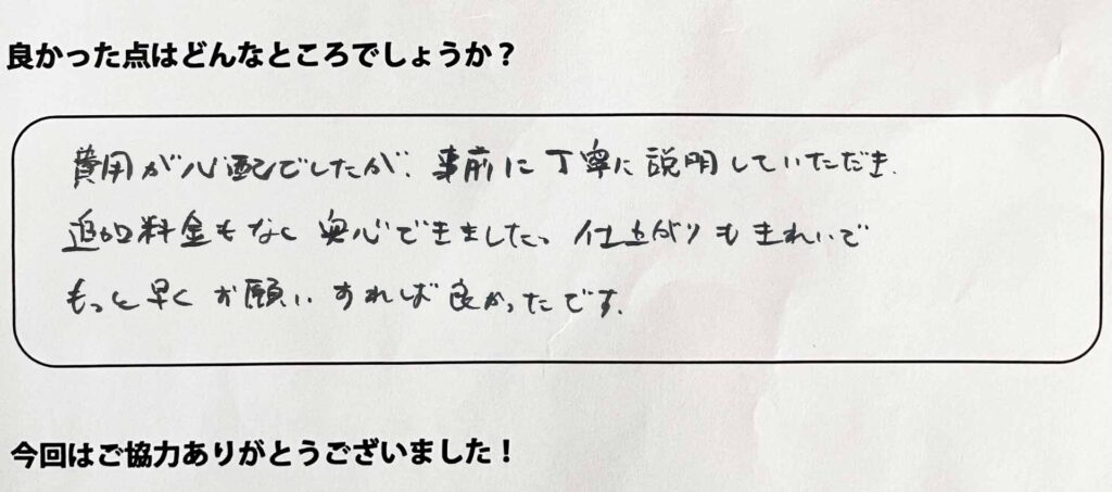 費用が心配でしたが、事前に丁寧に説明していただき、追加料金もなく安心できました。仕上がりもきれいで、もっと早くお願いすればよかったです。