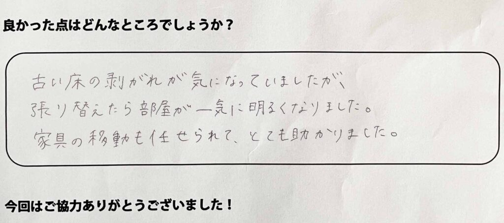 古い床の剥がれが気になっていましたが、張り替えたら部屋が一気に明るくなりました。家具の移動も任せられて、とても助かりました。